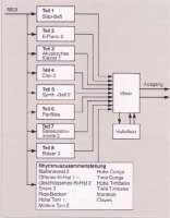 Der Rhythmusteil ist vom Synthesizerteil unabhängig, und Sie können das Stereo-Panning für jede Instrumentenstimme separat regeln oder die einzelnen Stimmen einem der sechs Mehrfachausgänge zuordnen,wo Sie sie individuell weiterverarbeiten können (z.B. durch ein externes Hallgerät für die Snare). Die einzelnen Stimmen können aber auch jeder beliebigen MIDI-Notennummer zugeordnet werden. Sie haben dann Zugriff zu allen Parametern (wie Dynamikinformation, Bender u.a,) Ihres MIDI-Steuergeräts. Mit den Programmierfunktionen des D-110 können Sie die vielen vorprogrammierten Samples für den Rhythmusteil verändern, so daß Sie genau den Klang bekommen, der Ihnen vorschwebt. Trommeln, Congas, Glocken, Becken und jede andereRhythmusstimme können Sie ganz nach Geschmack stimmen, damit sie in der Tonlage genau zur Musik passen. Sie können aber auch die Klangfarbe und andere Parameter (wie Attack, Decay etc.) abwandeln und völlig neue Rhythmusinstrumente bilden.